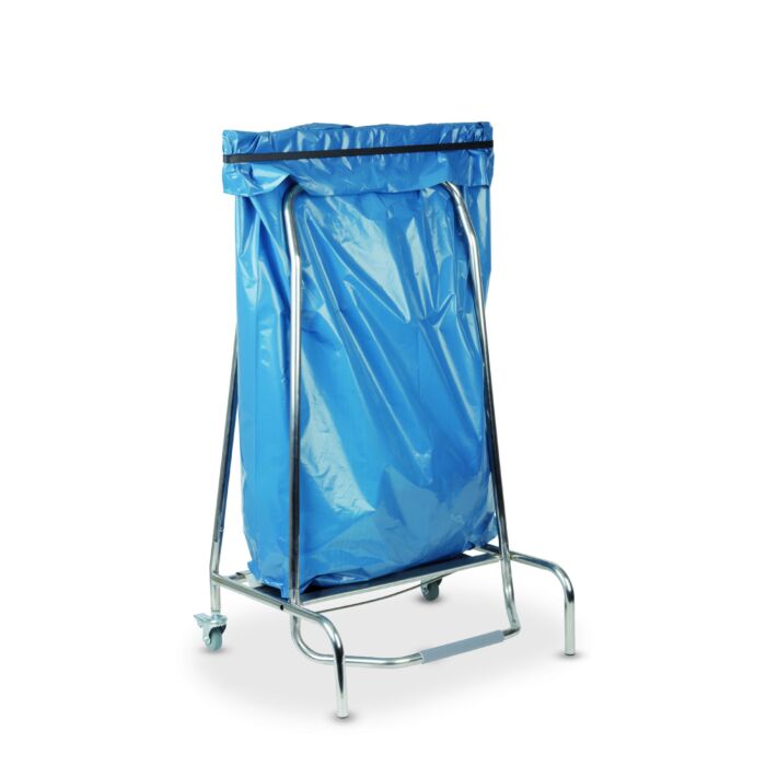 691021, Afvalzak houder, van het merk Hendi, Hoogwaardige horeca kwaliteit voor een aantrekkelijke prijs. Frame van roestvast staal. Voetbediend klem mechanisme houdt de zak gesloten. 2 wielen met remmen.