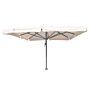 Deze Horeca parasol 3x3 meter Bali wit is een stevige en grote parasol die ideaal is voor gebruik op terrassen of in tuinen. Het vierkante doek biedt voldoende schaduw en zorgt voor een sfeervolle uitstraling. De parasol wordt geleverd met een beschermhoes en het doek is gemaakt van 300 grams polyester met een PU coating, wat het doek water- en vuilafstotend maakt. Let wel op dat bij langdurige regenval of hevige regenval, enige waterdruppels door het doek heen kunnen komen. De parasol heeft een aluminium frame. De parasolvoet is echter niet inbegrepen en moet apart besteld worden. Bij het bestellen van deze parasol moet je dus ook de gewenste parasolvoet kiezen uit de beschikbare opties. De parasolvoeten worden beschreven op de website en variëren in functionaliteit en uitvoering. De specificaties van de horeca parasol vind je op de website en bevatten onder andere de afmetingen, het materiaal van het doek en het frame, en de hoogte van de mast. De volant onderaan het doek biedt niet alleen extra decoratie maar kan ook voor extra schaduw zorgen bij een laagstaande zon.