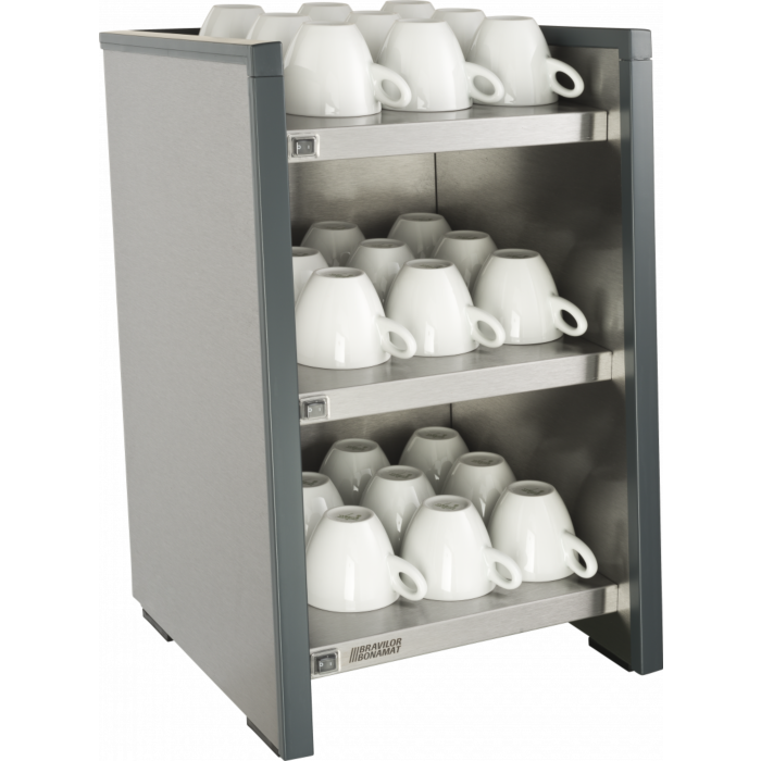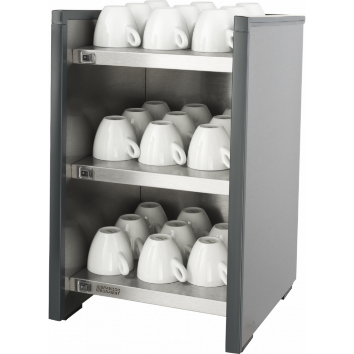 De WHK is een stijlvolle koppenwarmer voor koffiekoppen- of mokken. Er is ruimte voor ongeveer 120 koffiekopjes. Elk van de drie lagen is afzonderlijk aan en uit te zetten. De koppenwarmer is uitgevoerd in roestvrijstaal en verkrijgbaar in twee kleuren. Past bij alle koffiemachines van Bravilor Bonamat en in het bijzonder bij de Esprecious espressomachines.
